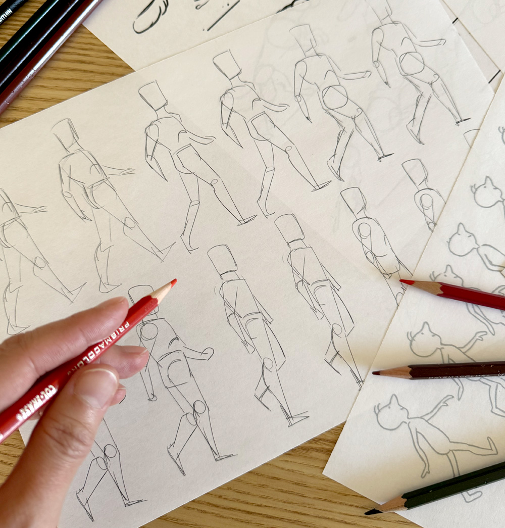 Diseñarás tu propio personaje desde cero. Aprenderemos el funcionamiento del ciclo de pasos, cómo se aplica a la parte inferior y superior del cuerpo, y lo aplicarás a tu personaje. Iremos frame a frame, entendiendo cómo la repetición y el ritmo construyen la ilusión del movimiento. Construiremos la animación a través de técnicas analógicas de dibujo.
